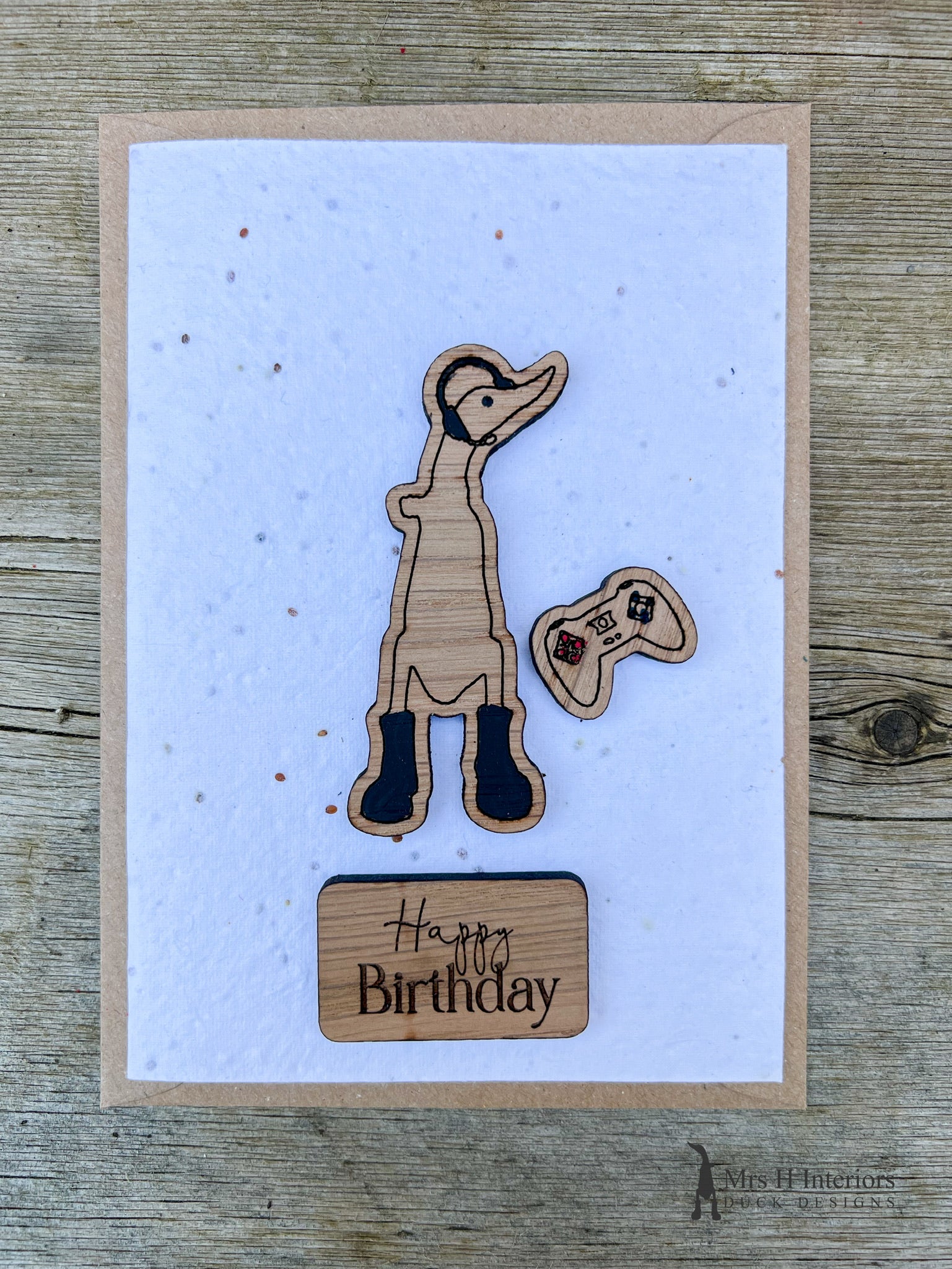 Handmade A6 Birthday or Father’s Day card - Gaming - duck character in oak playing computer games, with message board (now in oak) saying 'Happy Birthday' or 'Happy Father's Day' or your personalised (short!) message.