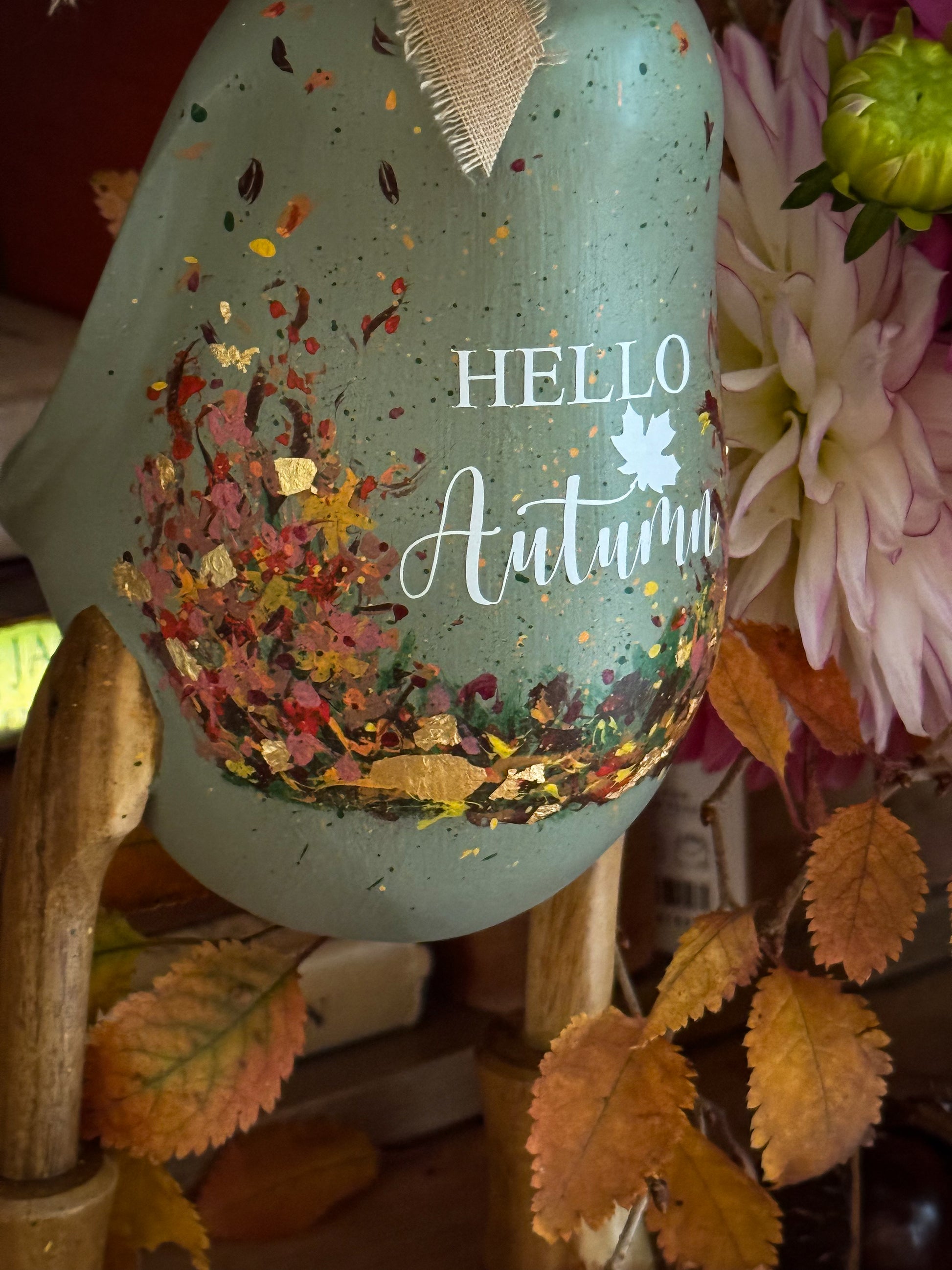 Hello Autumn. Hand painted in a rich sage green, with autumnal floral design, gold leaf and sealed with varnish so she’s also suitable for outdoors (ideally undercover from the worst of the weather). Complete with little felt toadstool and mini ‘pumpkin’ seed pods. She’s the full autumn package.