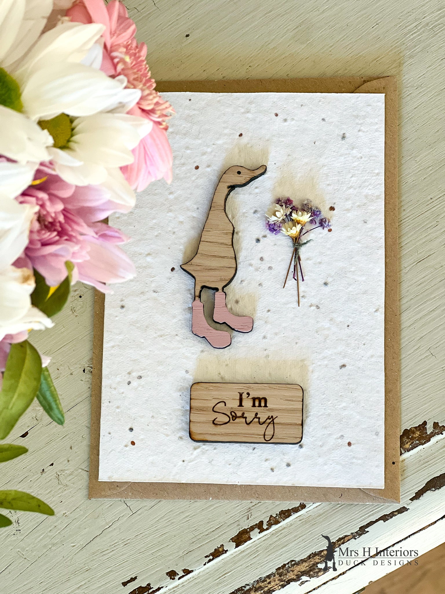 Handmade seed paper A6 greetings card, featuring a wooden duck with boots painted in your colour choice, carrying a gorgeous miniature bunch of flowers, with the message 'I'm Sorry'. Made from wild seed paper, so you can tear up and plant the back, gifting flowers as well as a card.