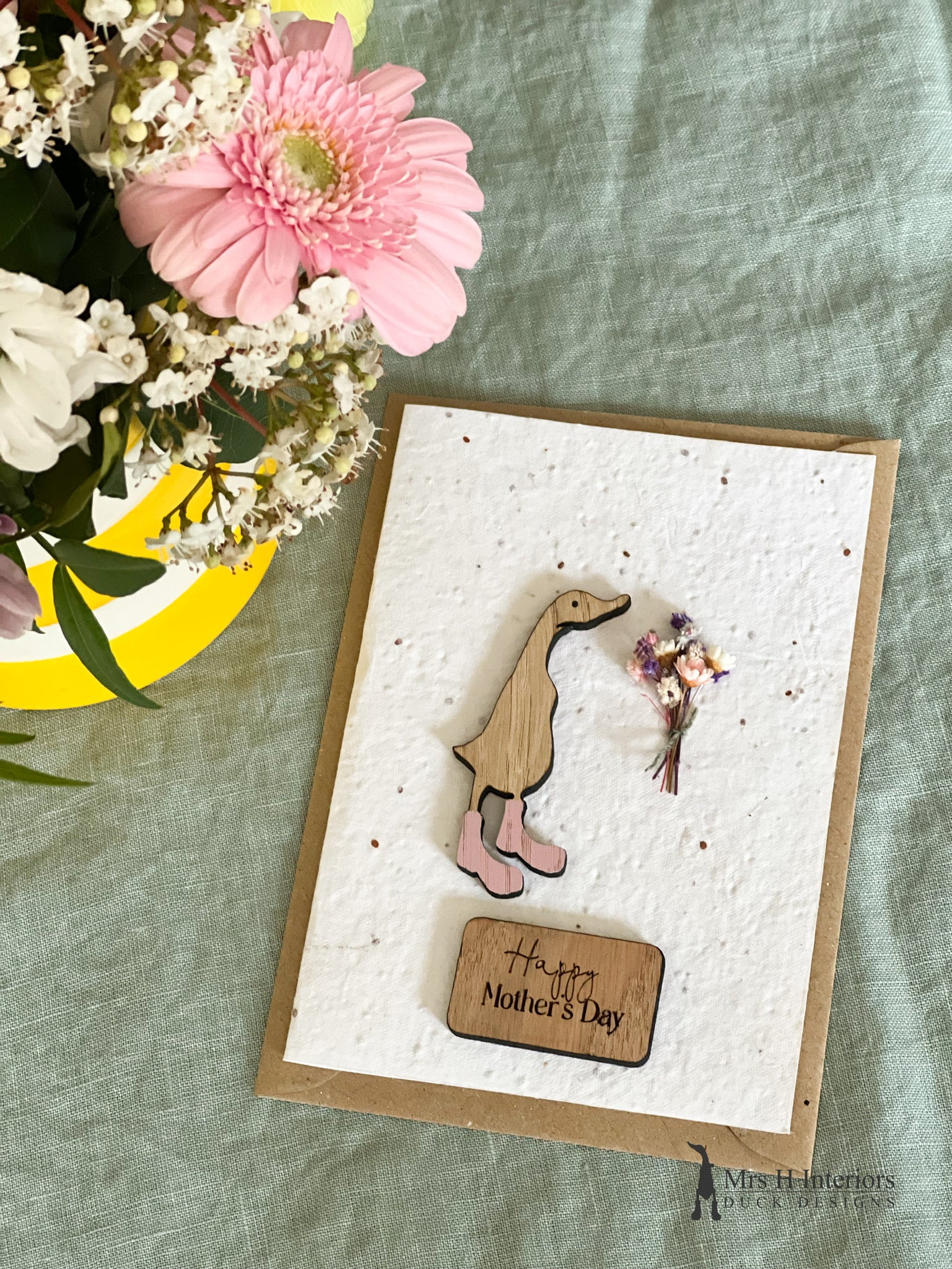 Handmade seed paper A6 greetings card, featuring a wooden duck with boots painted in your colour choice, carrying a gorgeous miniature bunch of flowers, with the message 'Happy Mother's Day'. Made from wild seed paper, so you can tear up and plant the back, gifting flowers as well as a card.